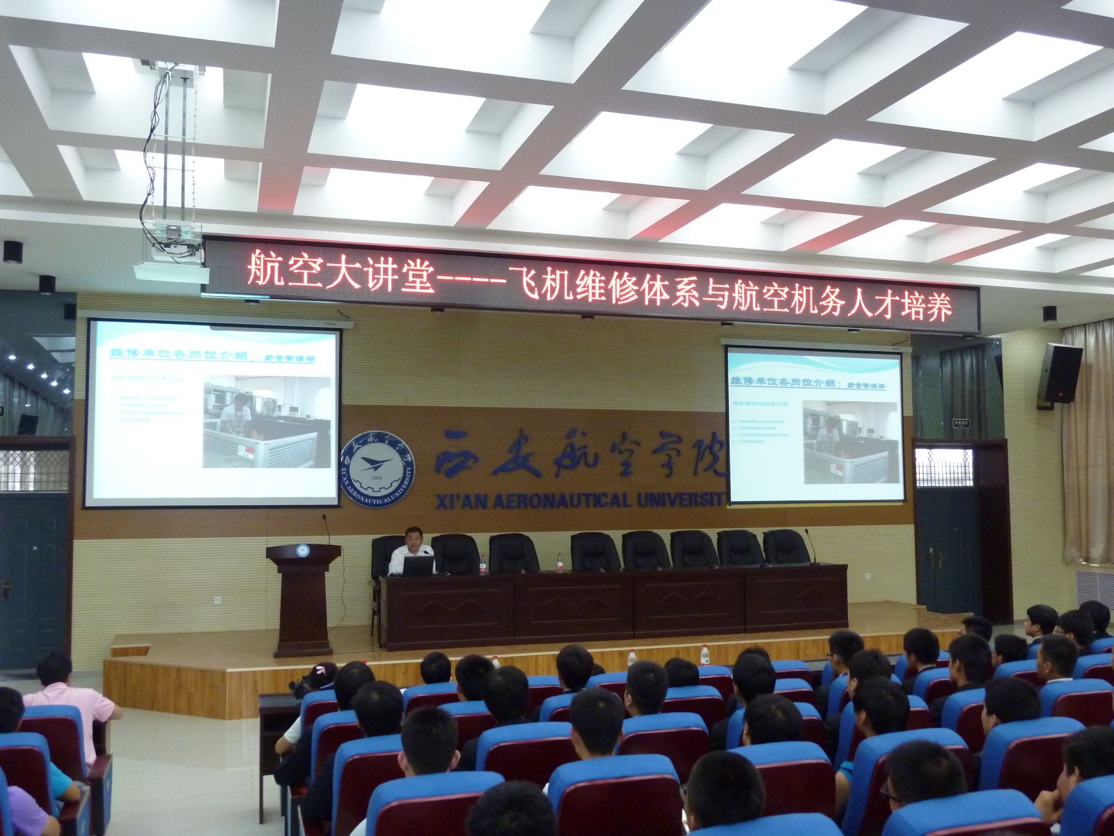 5月24日下午,由科技处和航空系共同举办的航空大讲堂“飞机维修体系与航空机务人才培养”在威尼斯官网阎良校区学术报告厅举行,本次学术报告由海航航空技术有限公司西北维修基地总监周贵敏主讲,航空系主任宋文学、党总支书记张耀虎、航空机电设备维修专业负责人余斌高及航空系相关专业学生近400人聆听了学术报告,报告会由宋文学主持。