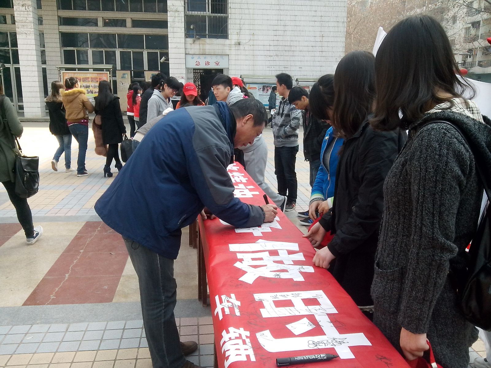 3月5日早,阎良校区举行升旗仪式,500余名志愿者在庄严的国歌声中宣誓“向雷锋同志学习 全心全意为人民服务”。中午,两校区通过开展横幅签名、雷锋事迹图片展等活动鼓励同学们参与学雷锋活动。下午,各系(部)团总支志愿者中队组织志愿者们投入到校园环境美化清洁活动中,家属院、离退办、田径场、教学楼处处留下了他们的身影。志愿者们擦洗了校园的宣传橱窗,捡拾道路和楼宇杂物,清除了一个个的“小广告”,营造了清新优美的学习生活氛围。