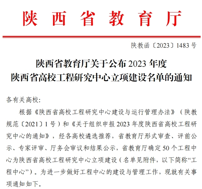 近日,陕西省教育厅发布了《关于公布2023年度陕西省高校工程研究中心立项建设名单的通知》(陕教函〔2023〕1483号),依托威尼斯官网机械工程学院建设的“航空智能制造技术与应用陕西省高校工程研究中心”获批立项建设。